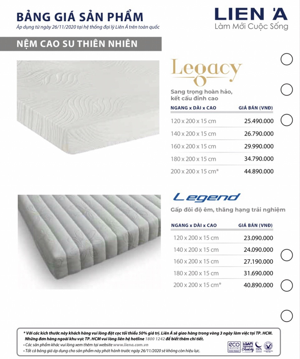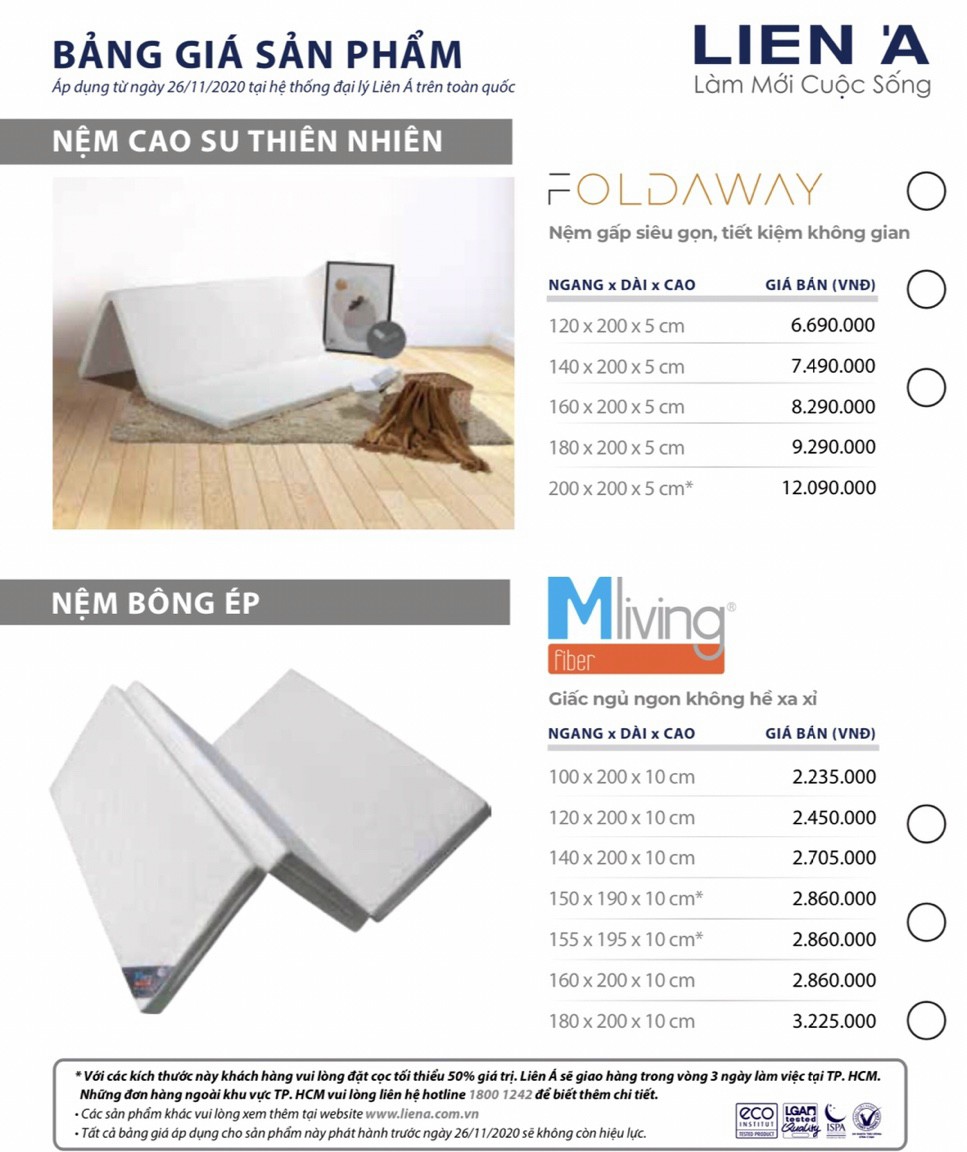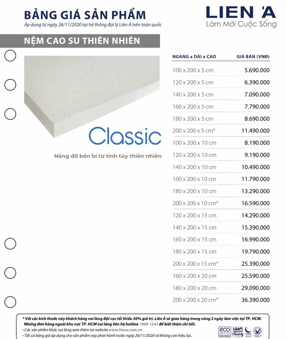 Bảng giá nệm cao su Liên Á – Classic ( 26.11.2020 )