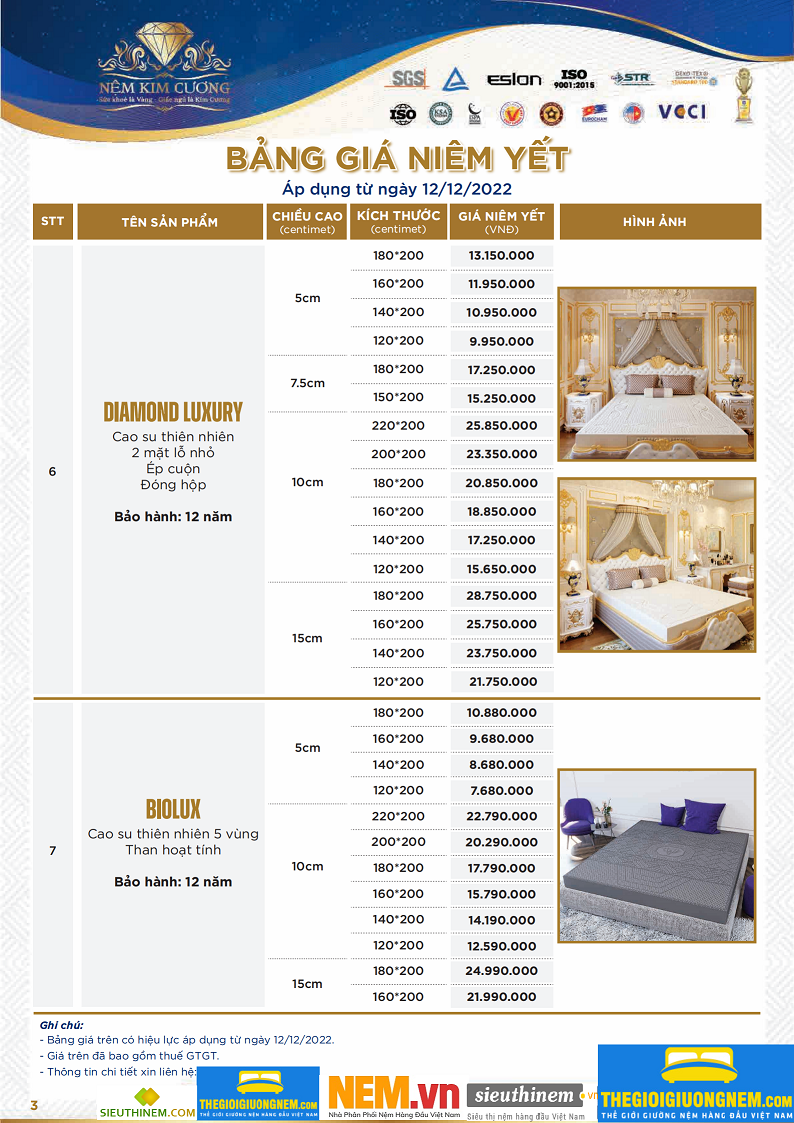 BẢNG GIÁ NỆM CAO SU KIM CƯƠNG 5 VÙNG THAN HOẠT TÍNH BIOLUX ( 28.09.2023 )
