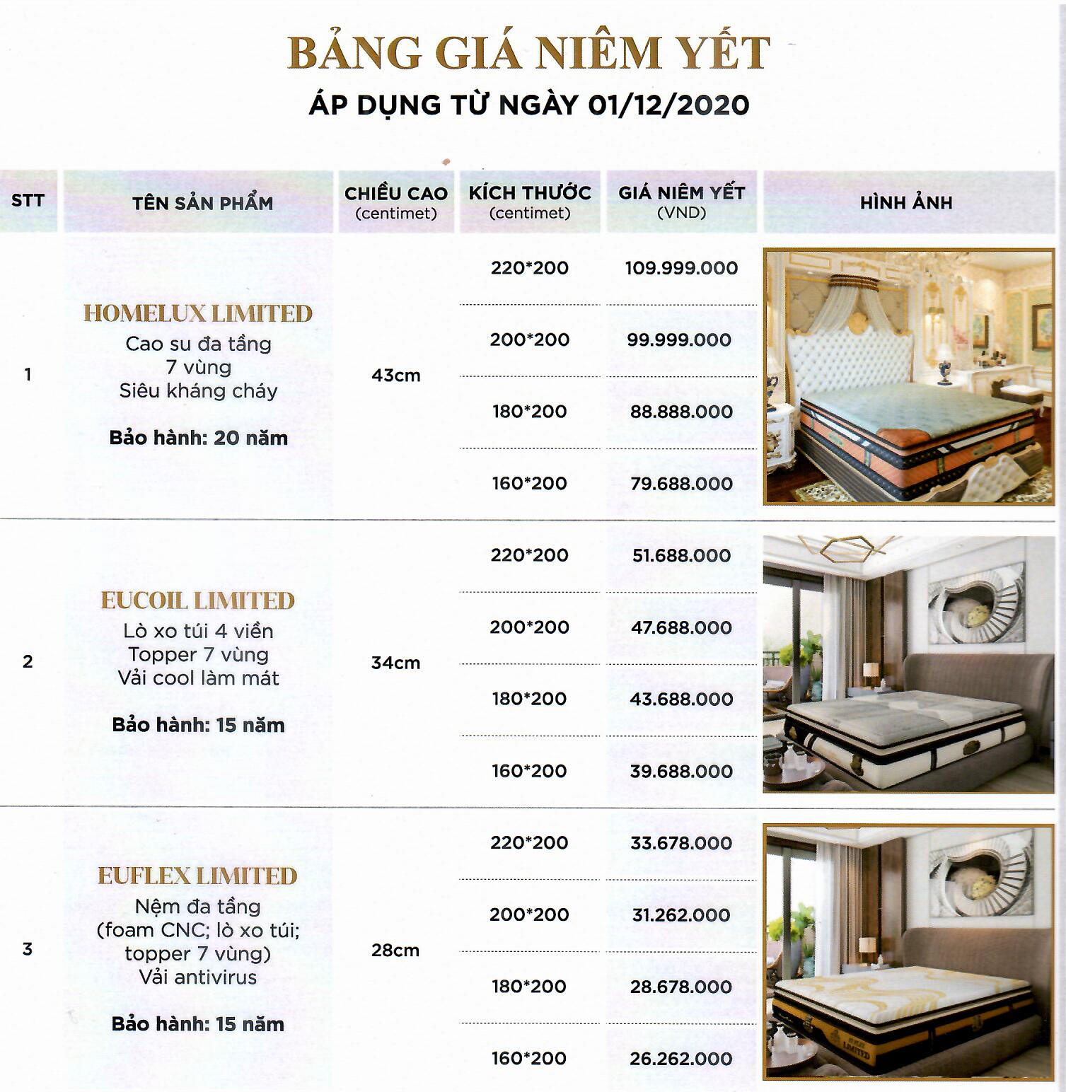 Bảng giá Euflex Limited - nệm lò xo + cao su kim cương đa tầng cao cấp ( 01.12.2020 )