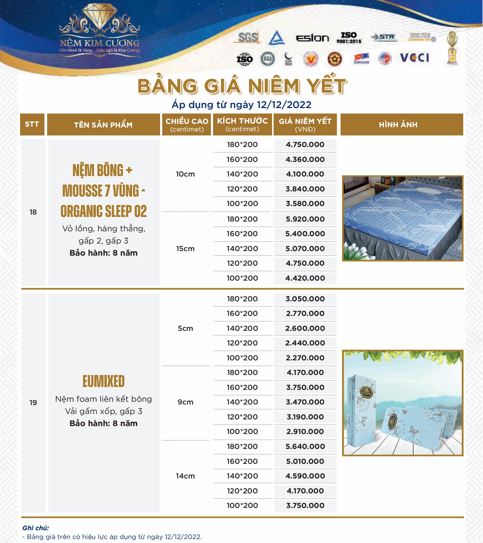 BẢNG GIÁ EUMIXED - NỆM FOAM LIÊN KẾT BÔNG VẢI GẤM XỐP GẤP 3 KIM CƯƠNG ( 03.12.2023 )