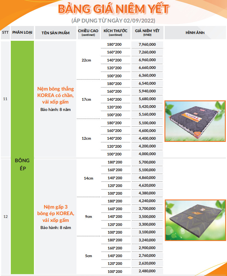 BẢNG GIÁ KHUYẾN MÃI NỆM BÔNG ÉP THẲNG KOREA - VẢI GẤM CHẦN GÒN ( 25.11.2023 )