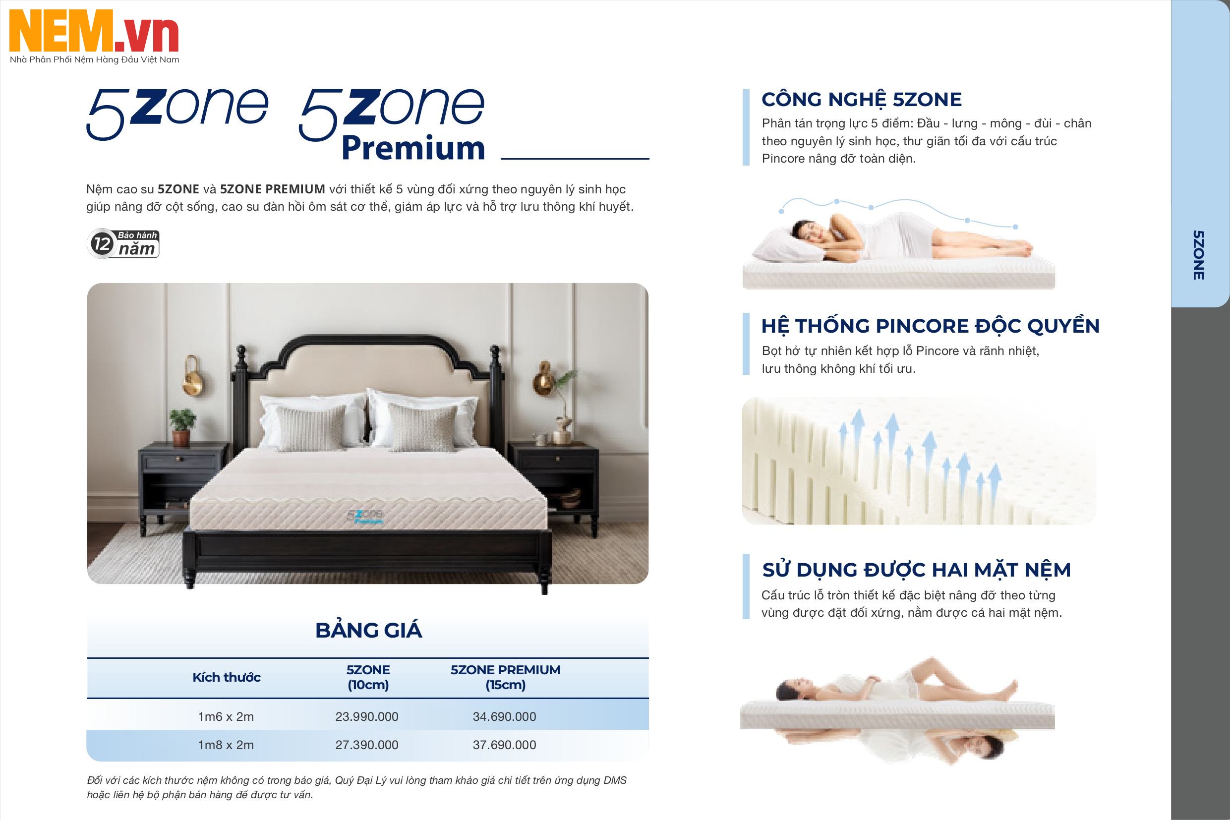 Nệm 100% cao su thiên nhiên, 5Zone là đỉnh cao của sự sáng tạo bởi thiết kế đột phá, xứng danh. 5Zone là chiếc nệm cao su thông minh đầu tiên tại Việt Nam bởi khả năng hiểu rõ từng chuyển động của cơ thể người nằm và tạo ra sự cân bằng tự nhiên phù hợp cho 5 vùng cơ thể khác nhau: đầu, lưng, mông, đùi và chân.