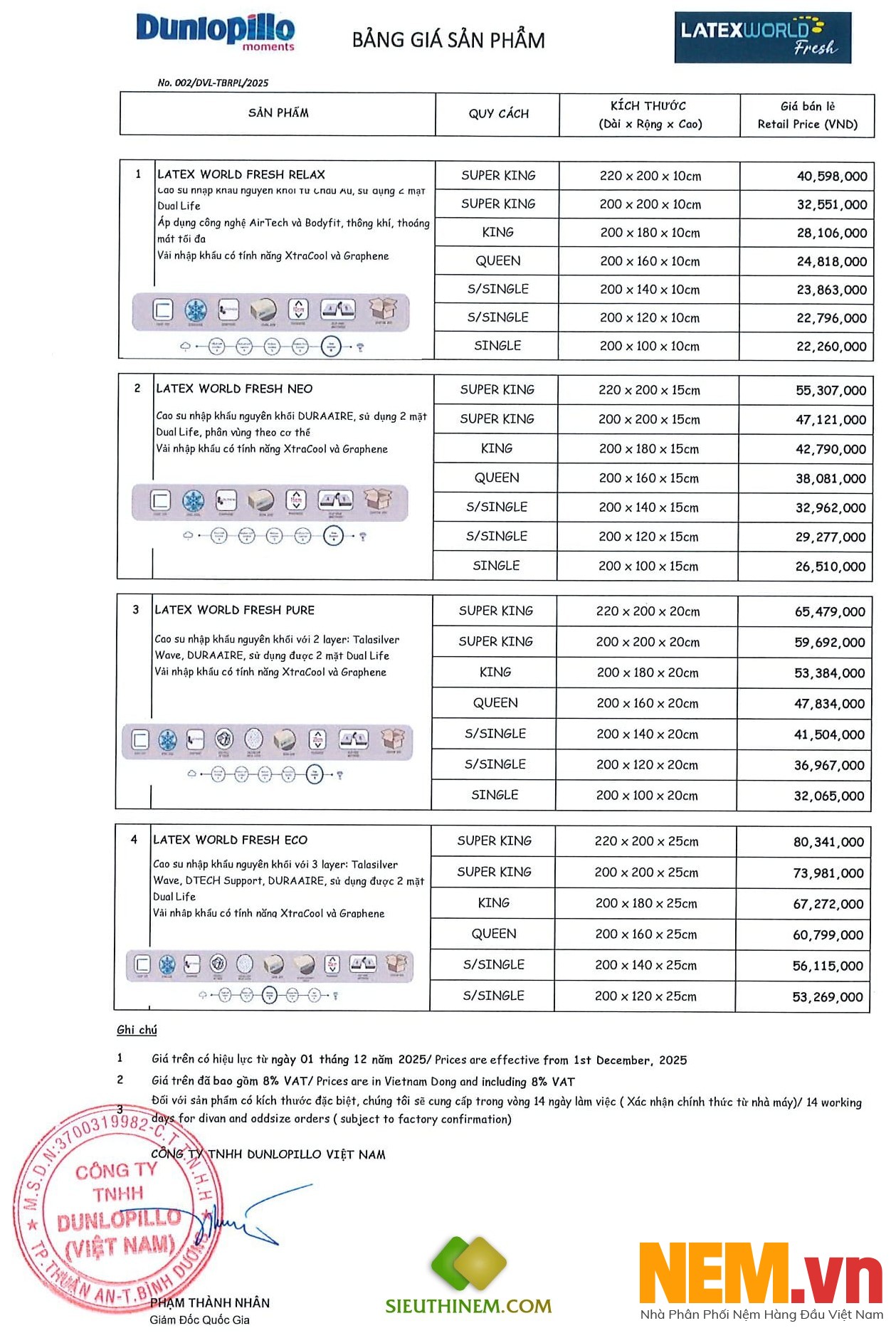 BẢNG GIÁ KHUYẾN MÃI NỆM CAO SU CAO CẤP DUNLOPILLO - LATEX WORLD FRESH ( 03.01.2026 )