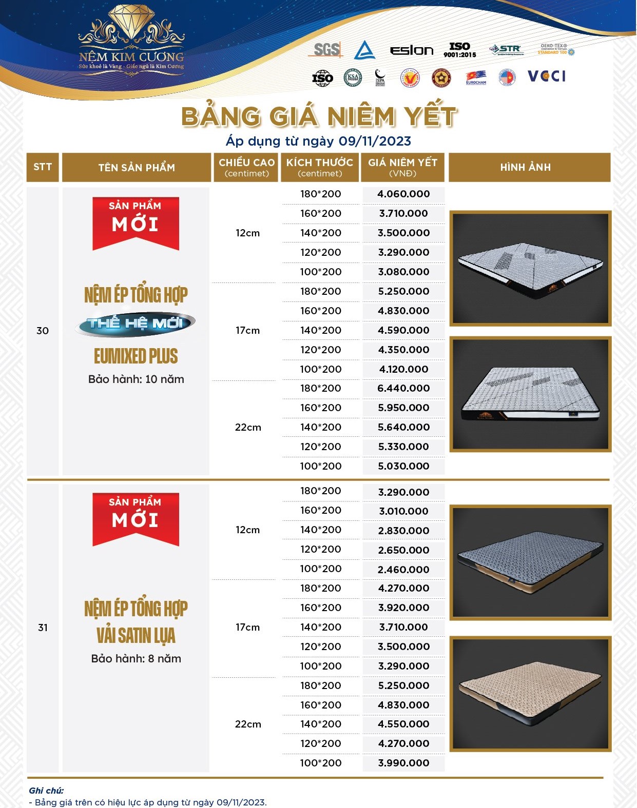 Bảng Giá Khuyến Mãi Nệm Cao Su Ép Tổng Hợp Kim Cương Vải Satin Lụa ( 05.12.2023 )