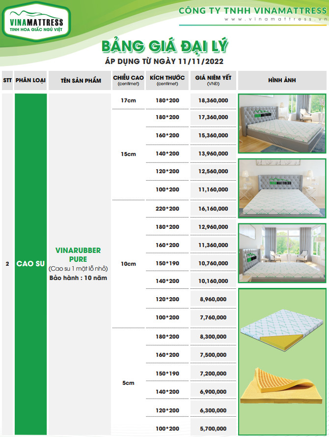 BẢNG GIÁ NỆM CAO SU VINAMATTRESS - VINARUBBER PURE ( 11/11/2022 )