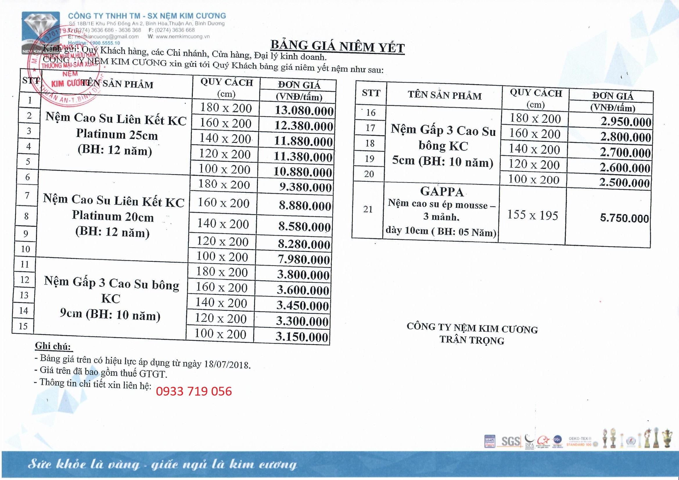 BẢNG GIÁ NỆM LIÊN KẾT CAO SU BÔNG KIM CƯƠNG