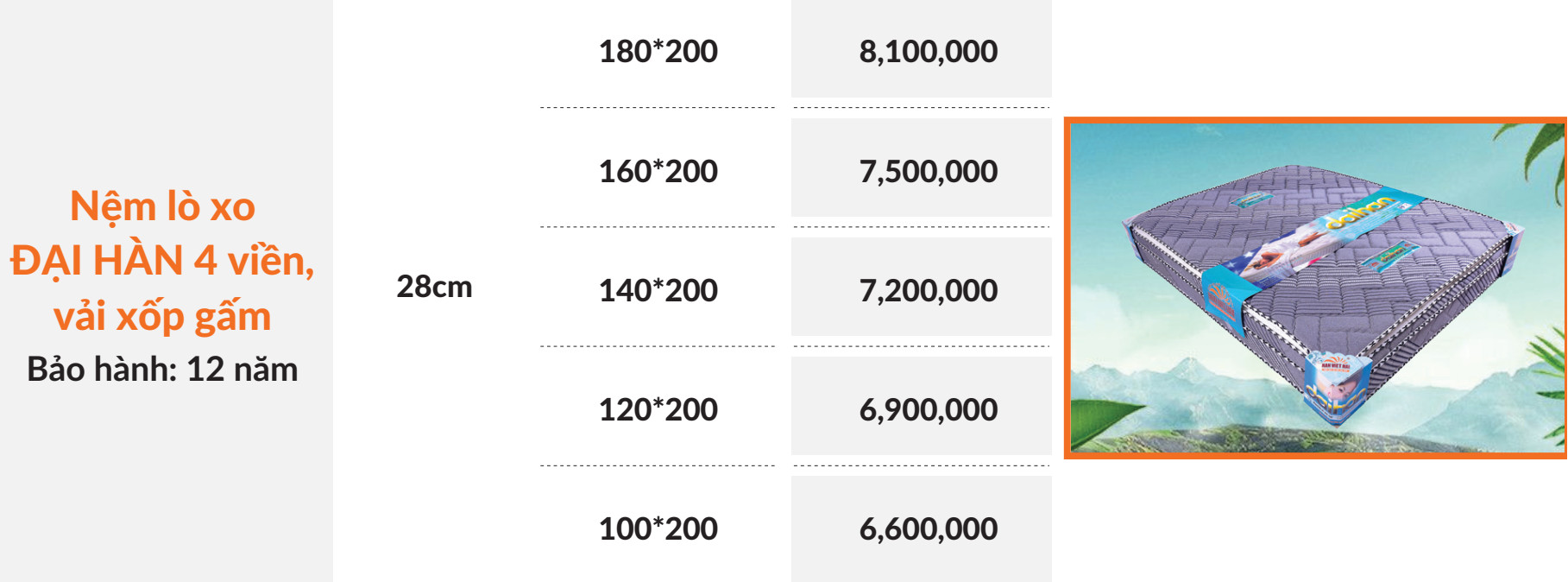 BẢNG GIÁ NỆM LÒ XO CAO CẤP ĐẠI HÀN 4 VIỀN VẢI GẤM - BẢO HÀNH 12 NĂM ( 29.10.2022 )