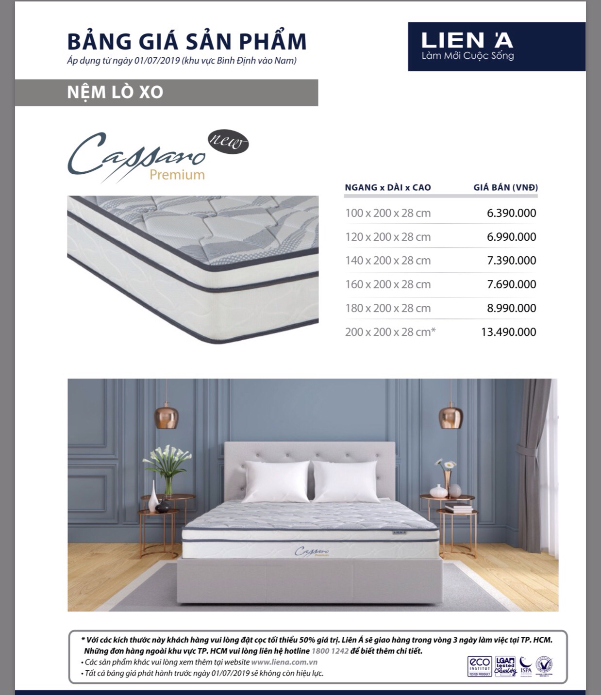 BẢNG GIÁ NỆM LÒ XO LIÊN Á - CASSARO PREMIUM